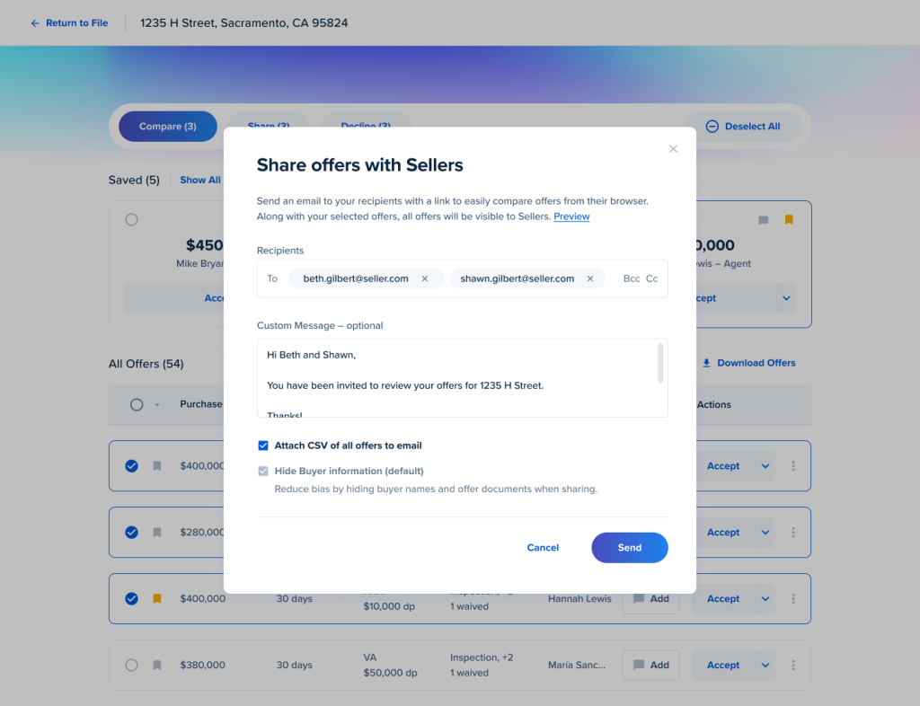 Buyer details — including buyer names — are obscured during the offer evaluation process to prevent the potential for bias.