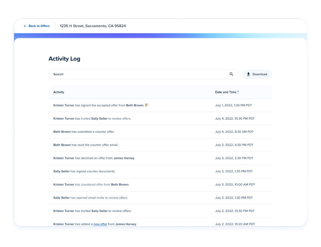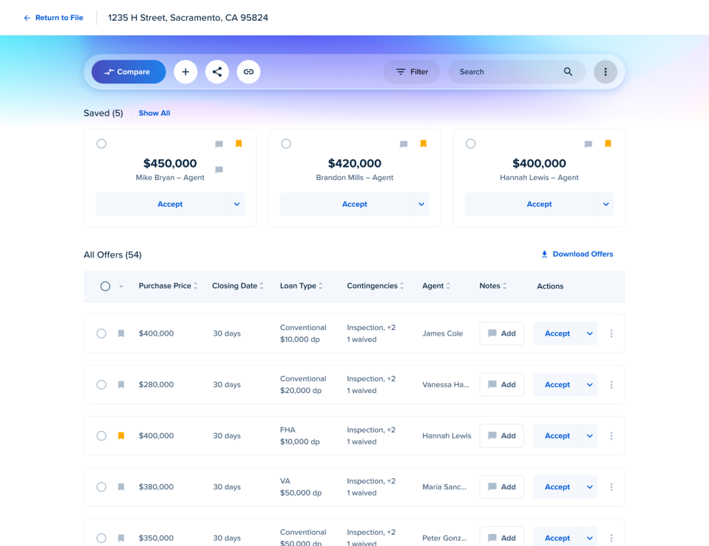 Every offer is displayed, sorted, and compared by multiple data points, including price, closing period, contingencies, and more.