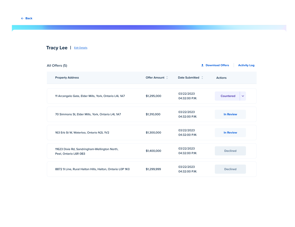 A centralized offers page gives listing agents a clear, organized view of all incoming offers in one place. It simplifies comparisons, reduces manual tracking, and keeps agents informed in real time, making it easier to respond quickly and guide their clients with confidence.